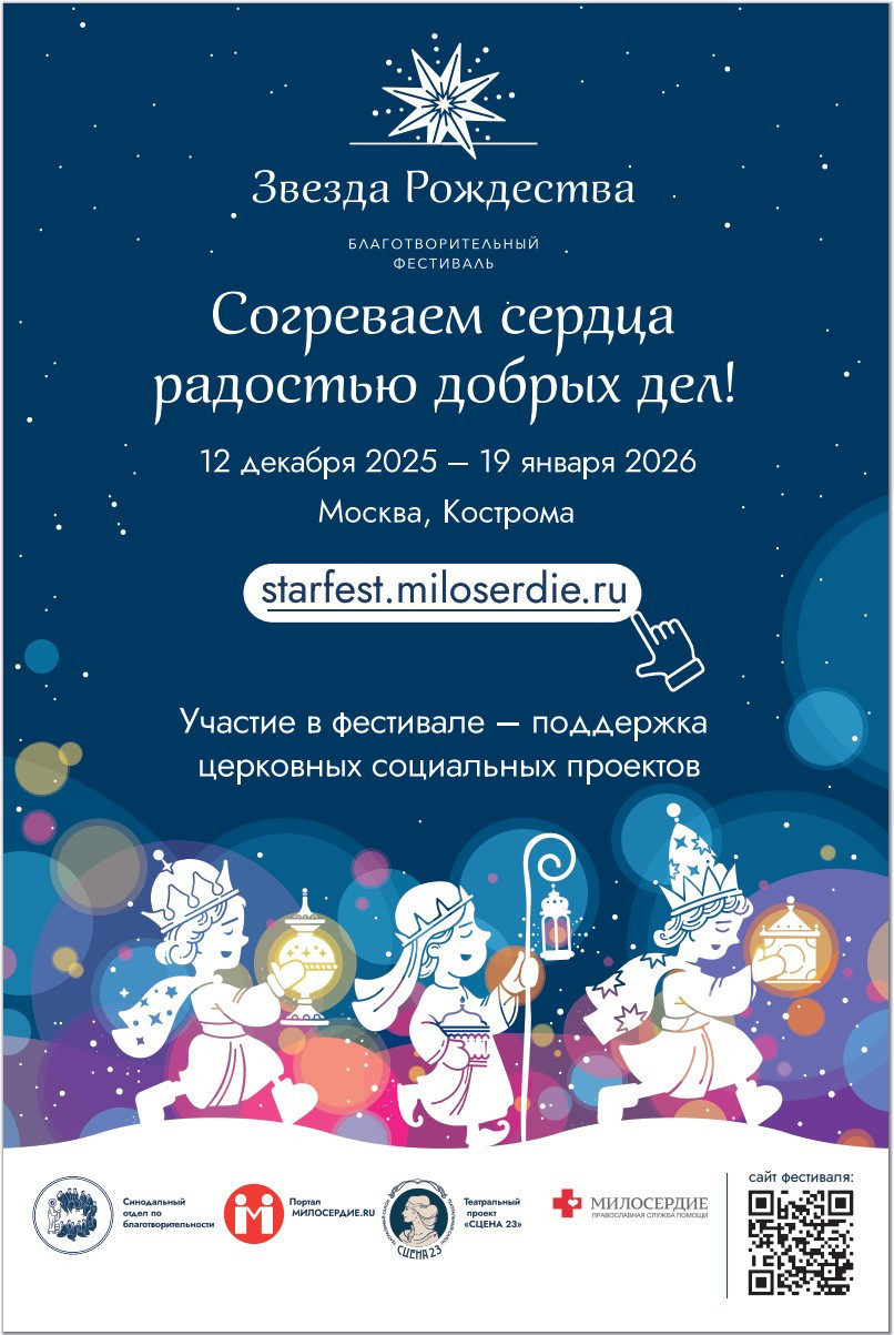 По благословению Святейшего Патриарха Московского и всея Руси КИРИЛЛА с 12 декабря 2025 г. по 19 января 2026 г. в Москве пройдет благотворительный фестиваль «Звезда Рождества», организованный православным порталом "Милосердие.ru» при поддержке Синодального отдела по церковной благотворительности и социальному служению.